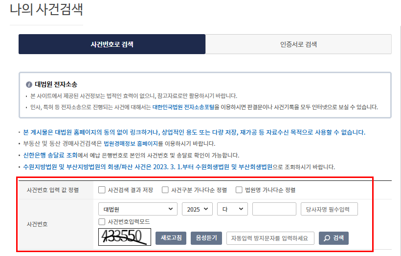 - 사건번호는 법원에서 부여한 고유 번호로, 반드시 정확하게 입력해야 조회 가능합니다.