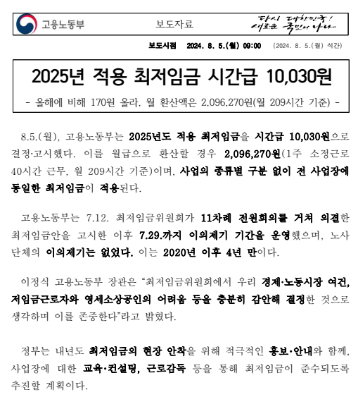 2024년 7월 12일, 최저임금위원회는 제11차 전원회의를 통해 2025년도 최저임금을 시간당 10,030원으로 의결하였습니다. 노동계는 10,120원을, 경영계는 10,030원을 제시하였으며, 투표 결과 경영계 안이 채택되었습니다.